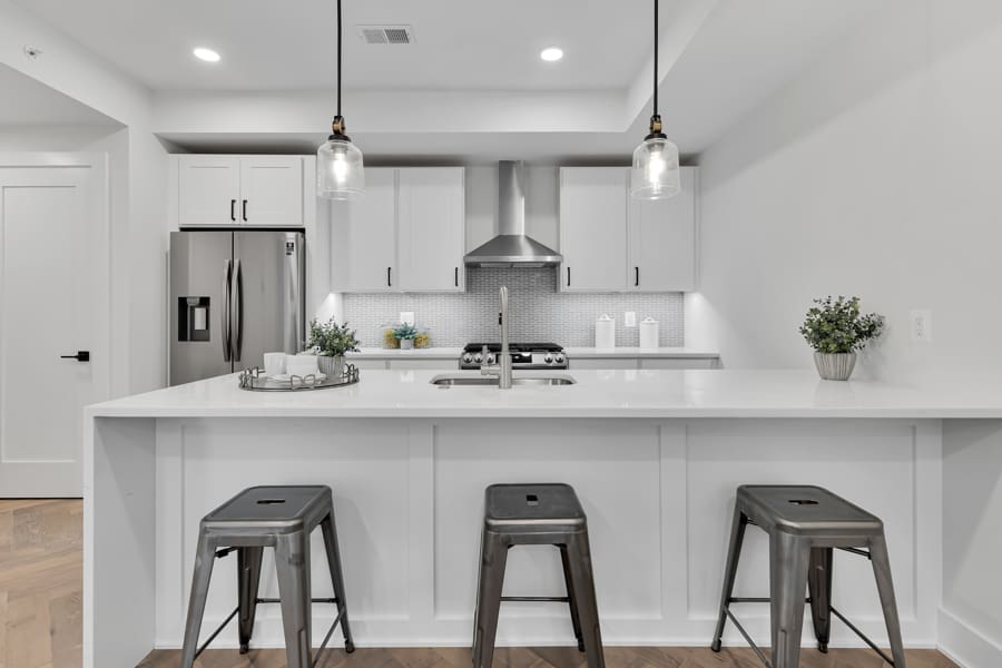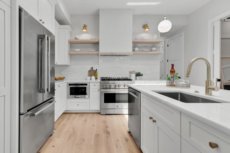 To keep things bright and airy, we love a simple black and white color palette with pops of color brought in through appliances and dishes while steering clear of superfluous clutter and unneeded prints and patterns. Along with well-crafted cabinetry, smart storage solutions are vital to keep surfaces organized and clutter-free.