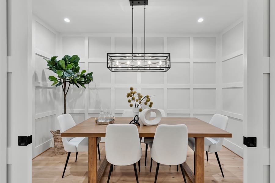 Here, a stylish light fixture and coffered wall bring just the right amount of personality to pull off the timeless, appetizing look guests and residents alike crave.