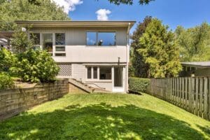 Step inside and find soaring ceilings, hardwood floors and ample natural light throughout the home. The expansive back wall, adorned with floor-to-ceiling glass panels, beautifully frames captivating views of the backyard, establishing a harmonious transition between the indoor and outdoor spaces. The living room boasts a welcoming fireplace, and its seamless flow leads to the huge deck that overlooks the lush backyard.