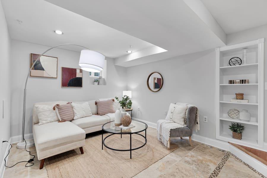 Additional Advantages: The surprises continue upstairs, where you’ll find a hall bath outfitted with chic subway/hexagonal tiling and three legitimate bedrooms, including the Primary Suite that stuns with its ensuite bath and tree-lined views of the street below. Two levels down, the home’s fully finished basement doubles as a guest suite that doesn’t skimp on luxuries — from its full bedroom to the spa-like bath and expansive living area.